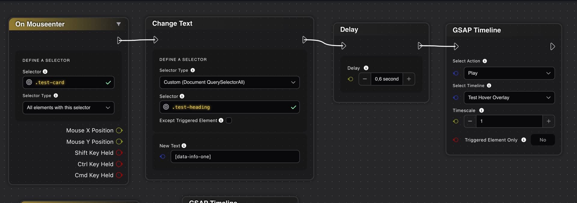 How can we Use data-attributes on the change text node? I have a attribute stored in my query loop card and i want a text to change on hover to the Project titel (which is the dynamic value on the card) .. is there any way to achiv this without custom js?