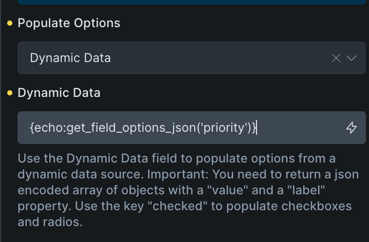 example: echo get_field_options_json(‘priority’);