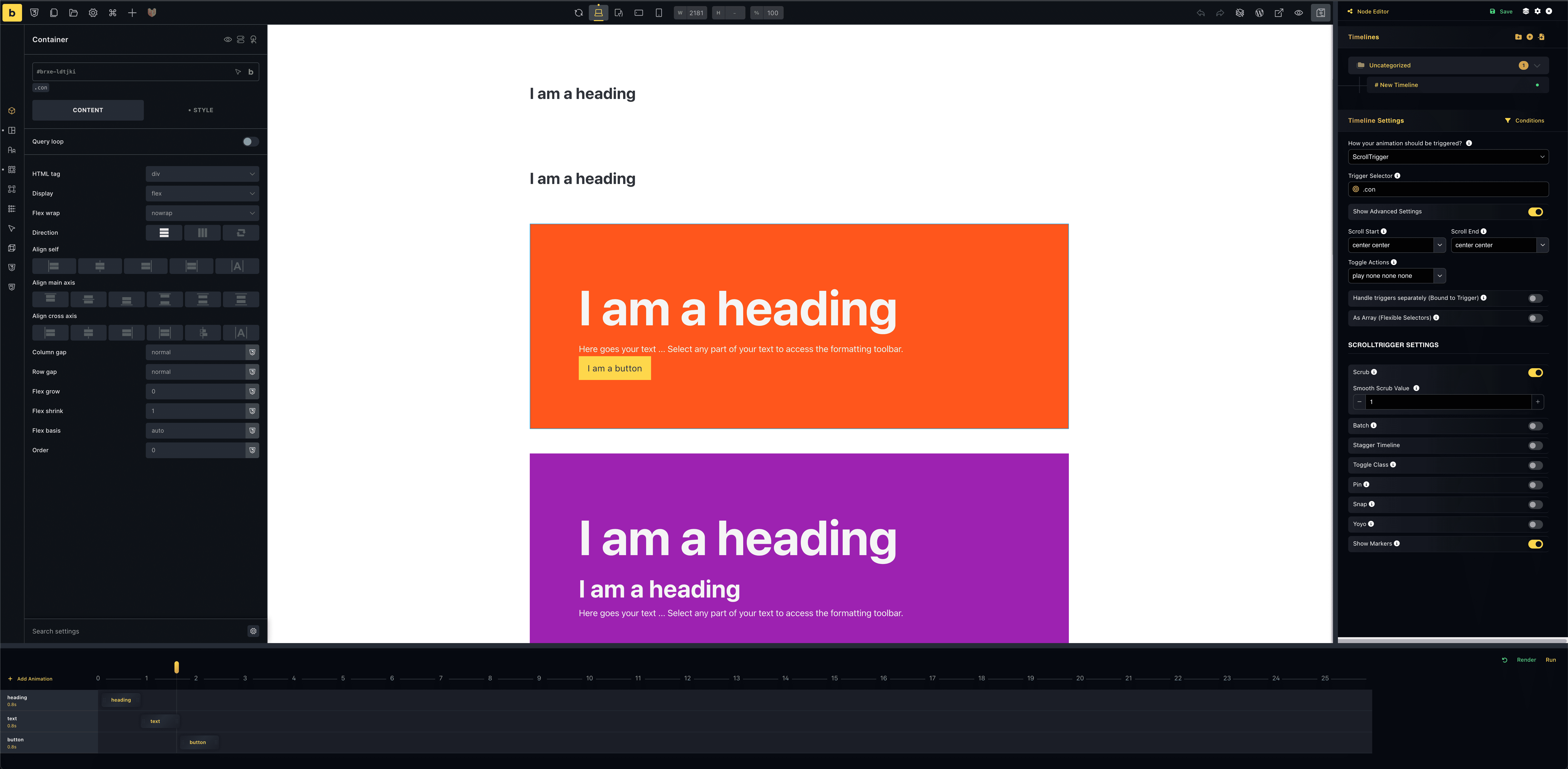 I created a section with a container with the class “.con” which is a trigger in the timeline (Scroll Trigger).