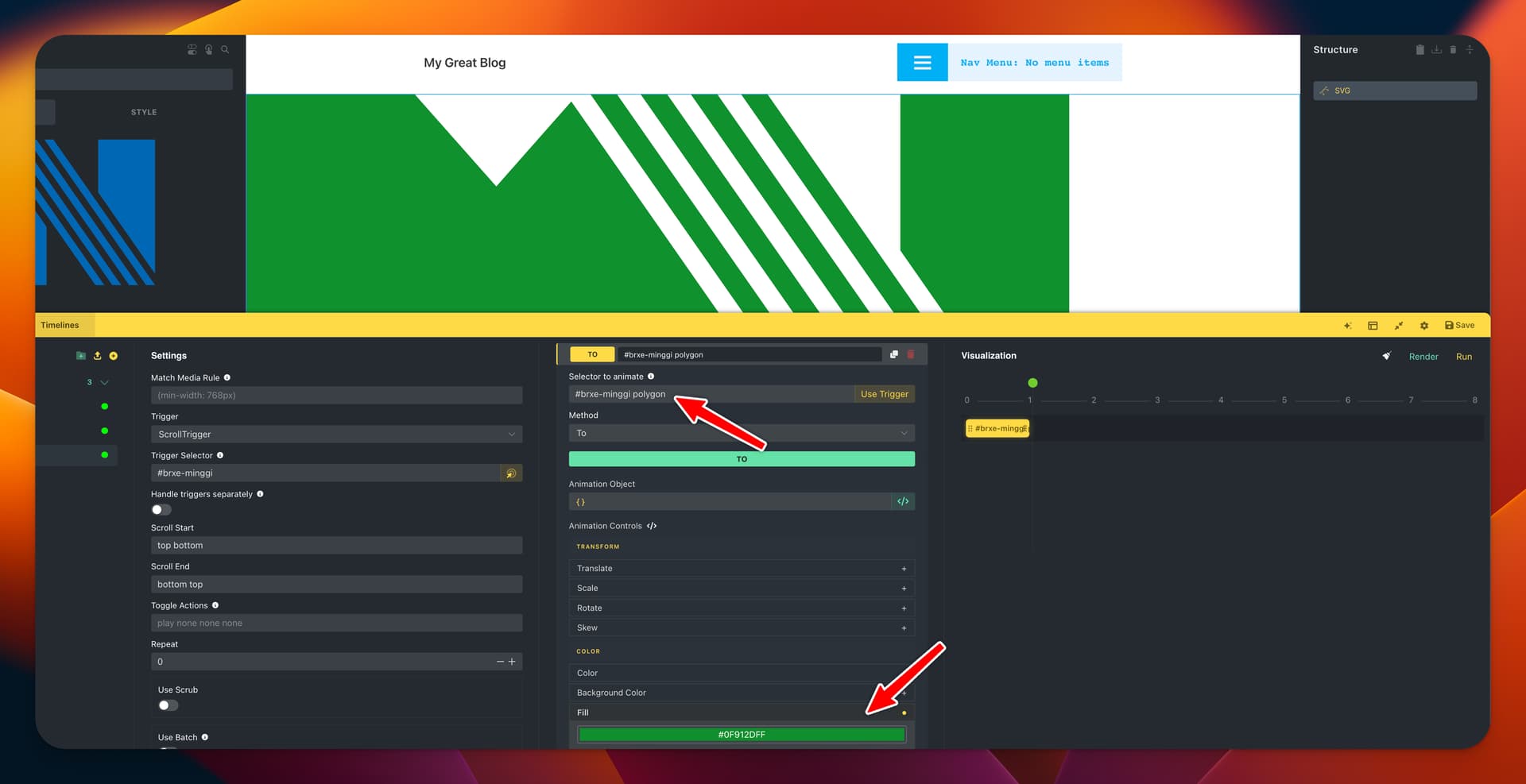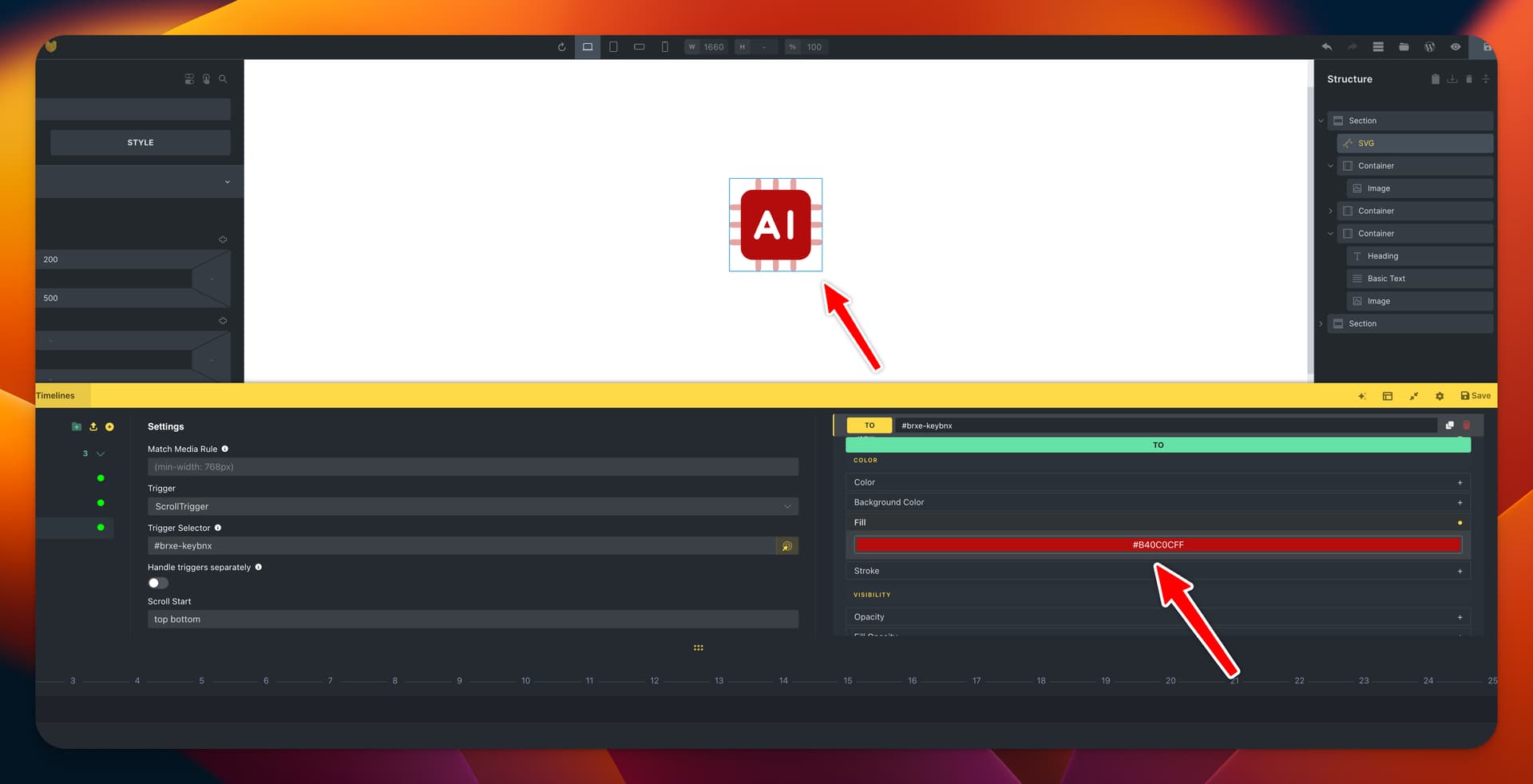 In the GSAP Animations panel rest an option for changing the fill. I guess this is for SVGs. So I tried to trigger it - but with no success. If I change the fill inside the SVG Bricks element it works well. Also everything else is set up right - as for example the backdrop color of the SVG reacts well.