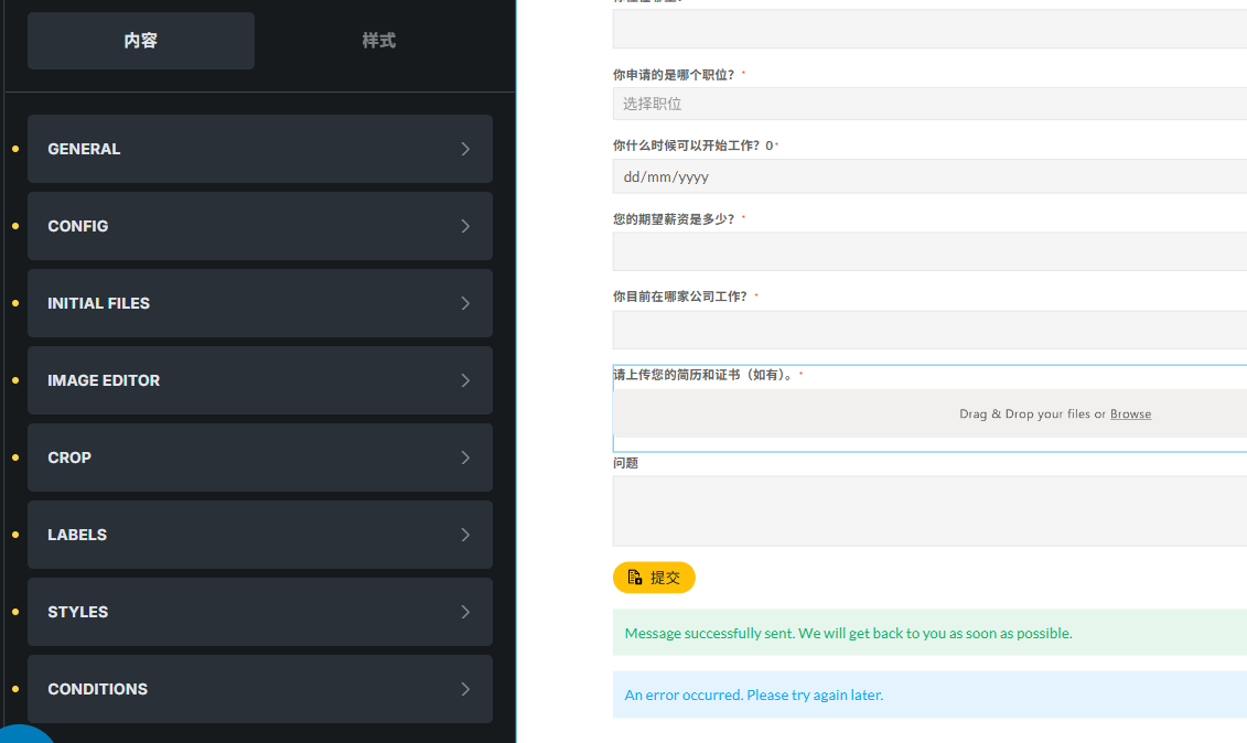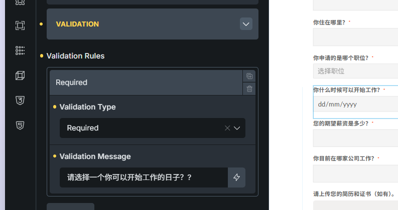 Important: Simply setting the field as “required” (the checkbox) is not enough for custom messages. The browser will show its native validation message in that case. You need to explicitly add a validation rule with your custom message in the Validation tab.
